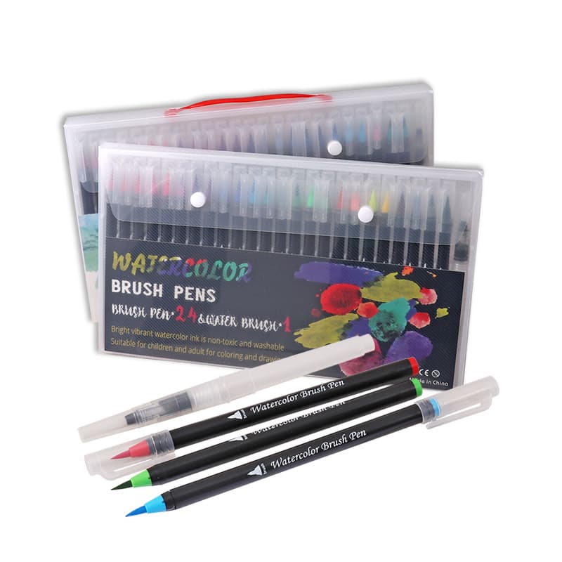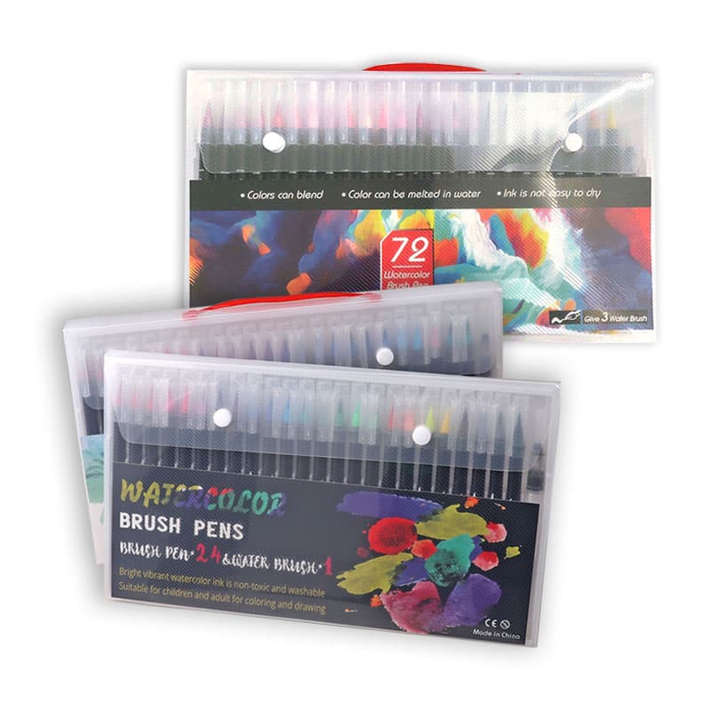 Canetas pincel aquareladas combinam a praticidade de uma caneta com a flexibilidade artística das aquarelas, permitindo linhas com diferentes larguras e misturas de cores vibrantes.