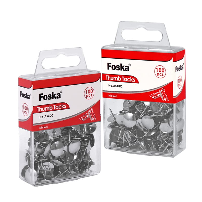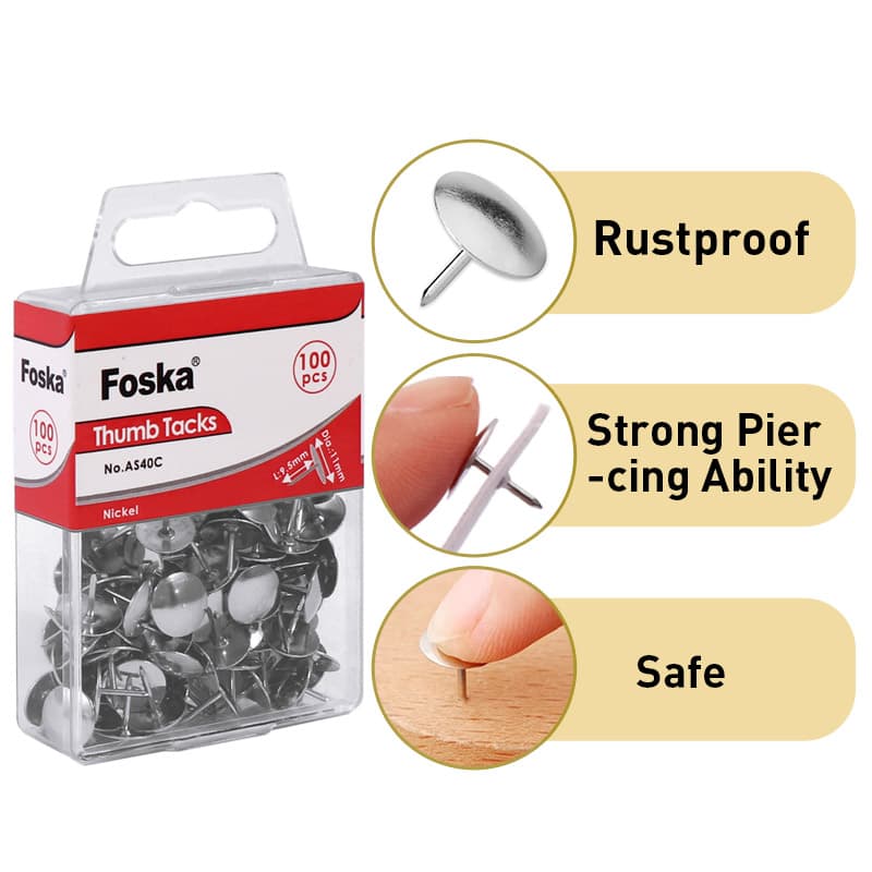 Nosso produto premium tachinhas niqueladas Fabricados em aço resistente com um acabamento liso em níquel antiferrugem, esses tachinhas oferecem durabilidade e resistência à corrosão para uso diário no escritório. Cada tachinha possui uma ponta afiada e precisa para fácil inserção em quadros de cortiça, murais, painéis de madeira e divisórias de escritórios, enquanto a cabeça plana e arredondada fixa firmemente documentos, memorandos, fotos, pôsteres e mapas sem escorregar ou danificar os papéis.