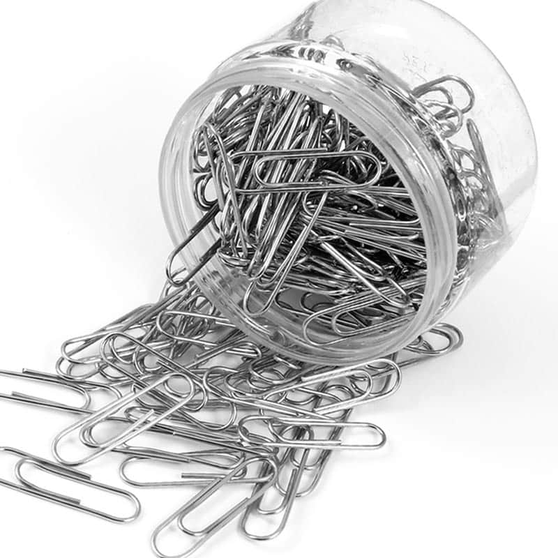 Clipes de papel niquelados e revestidos de vinil estão disponíveis para uso em escritório.